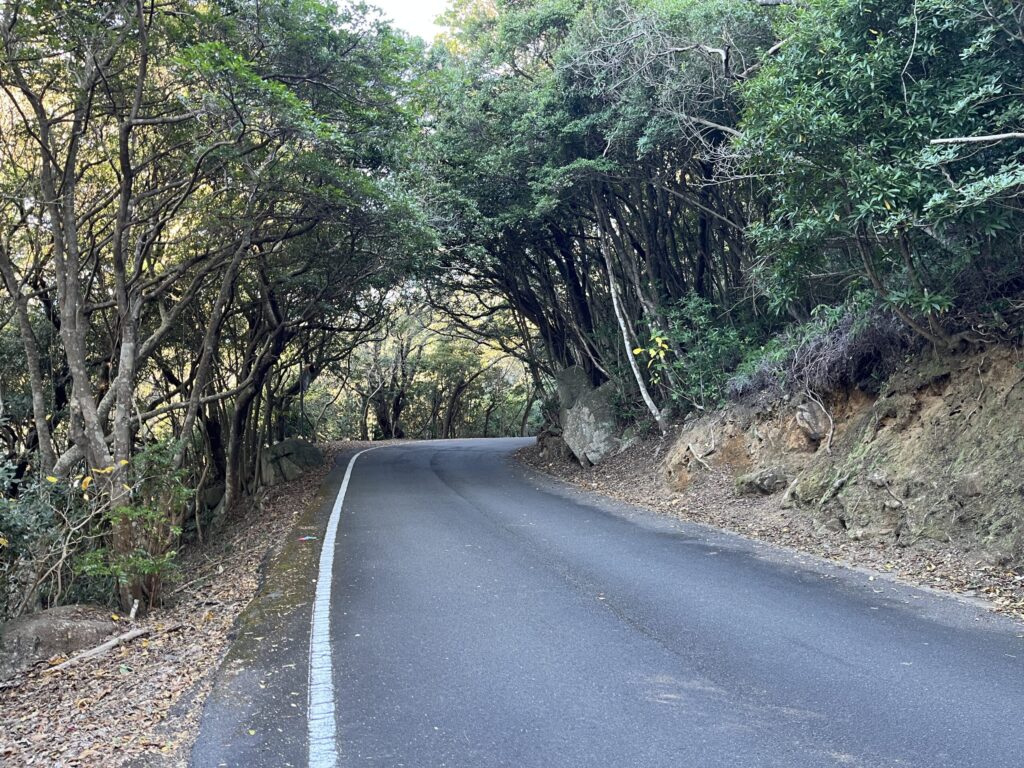 この道を100mほど先に行くと、灯台へ抜ける道。少し広くなった路肩があるものの、車が置けるとしても2、3台。